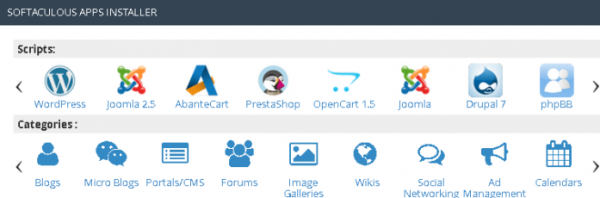 В пакеты с виртуальным хостингом входит скрипт автоматической установки популярных CMS Softaculous. Он расположен в отдельном меню Softaculous Apps Installer.