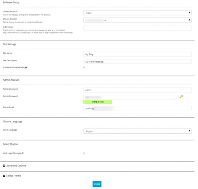 При нажатии кнопки Install производится переход к диалогу установки. На данном этапе нужно указать, для какого домена будет произведена установка, вид, по которому будет доступен сайт (http: либо https: , если у вас есть SSL-сертификат, также домен с www либо без), указать название и ввести краткое описание сайта, и логин/пароль администратора ресурса. После ввода всех указанных данных нужно нажать кнопку Install внизу страницы. После этого будет произведен процесс установки, и после ее завершения выведено уведомление об успешном завершении.